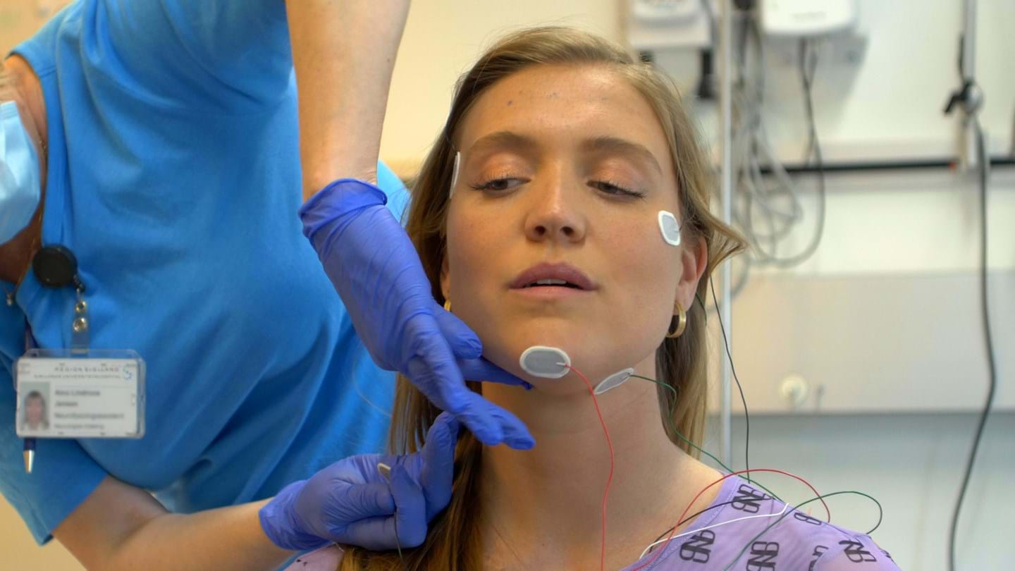 Efter to timer sammen med Troels’ assistent har jeg 21 elektroder og ledninger fordelt på mit ansigt, hoved, bryst, mave og ben, som skal måle den elektriske aktivitet i hjernebarken.